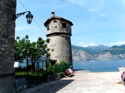 Der Campingplatz liegt mitten in Malcesine unterhalb des Castello mit Blick auf den Burgfried.
