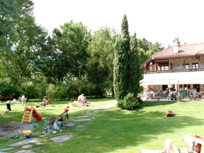 Die schattige Liegewiese ist schön groß und es giebt auch eine Strandbar.